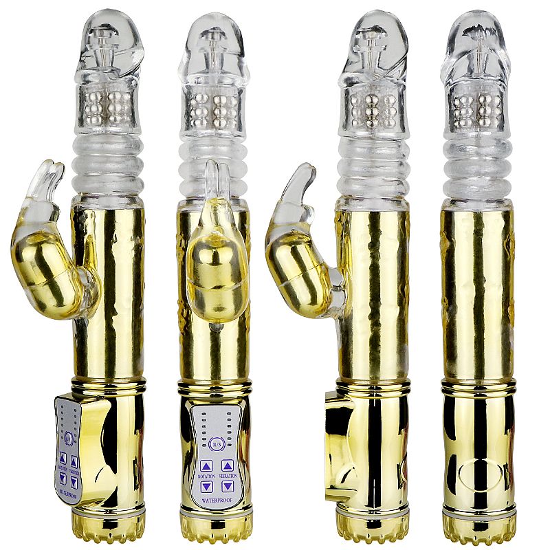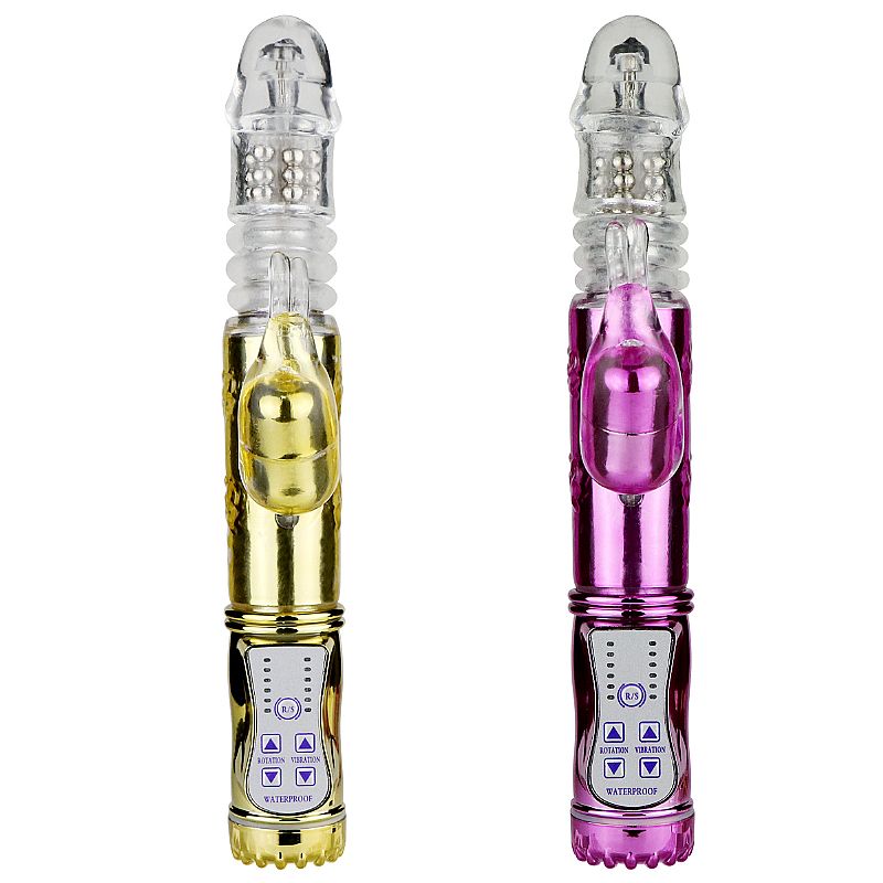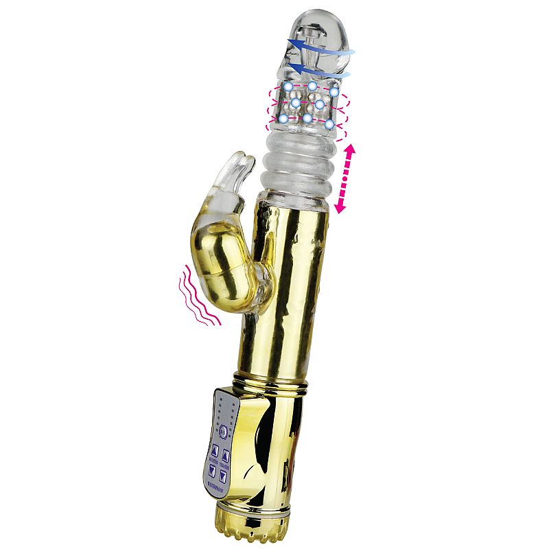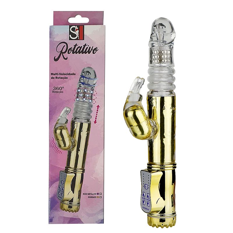 Vibrador Rotativo, feito em material macio e de fácil limpeza. Tem a ponta com uma curva para a estimulação do ponto G, também possui um plug em sua lateral em formato de Coelho, para estimular o clitóris durante a penetração.