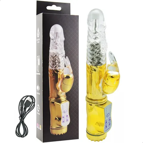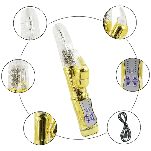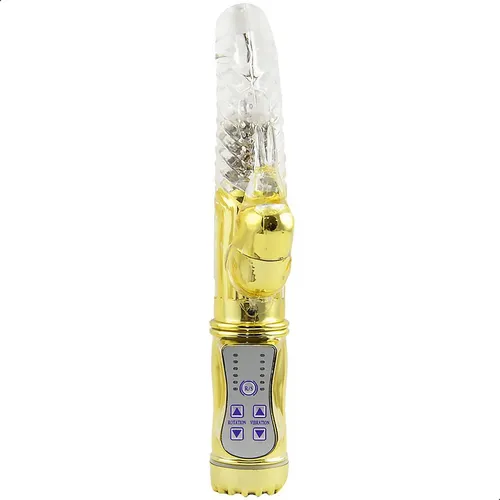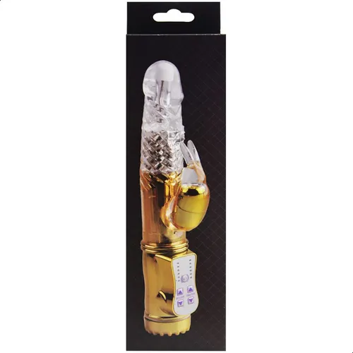 Vibrador Rotativo, feito em material macio e de fácil limpeza, tem a ponta com uma curva para a estimulação do ponto G, também possui um plug em sua lateral em formato de Coelho, para estimular o clitóris durante a penetração.