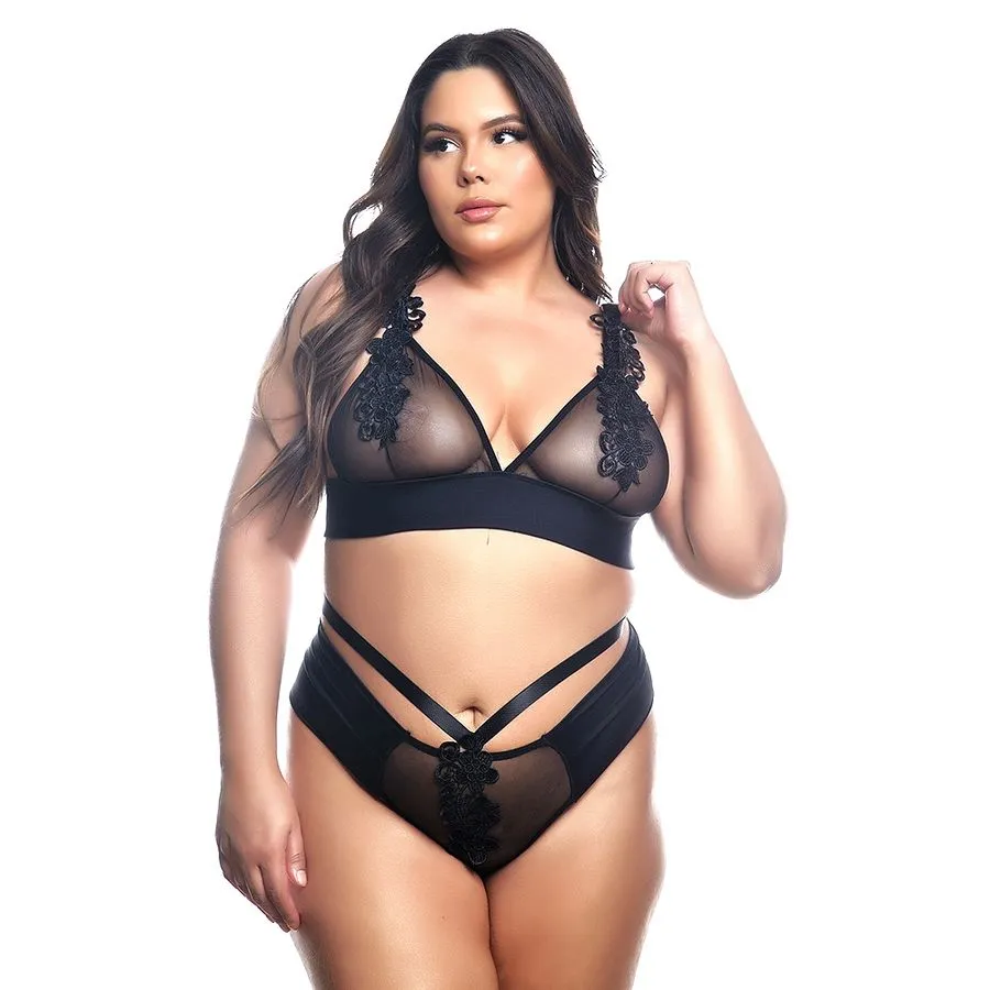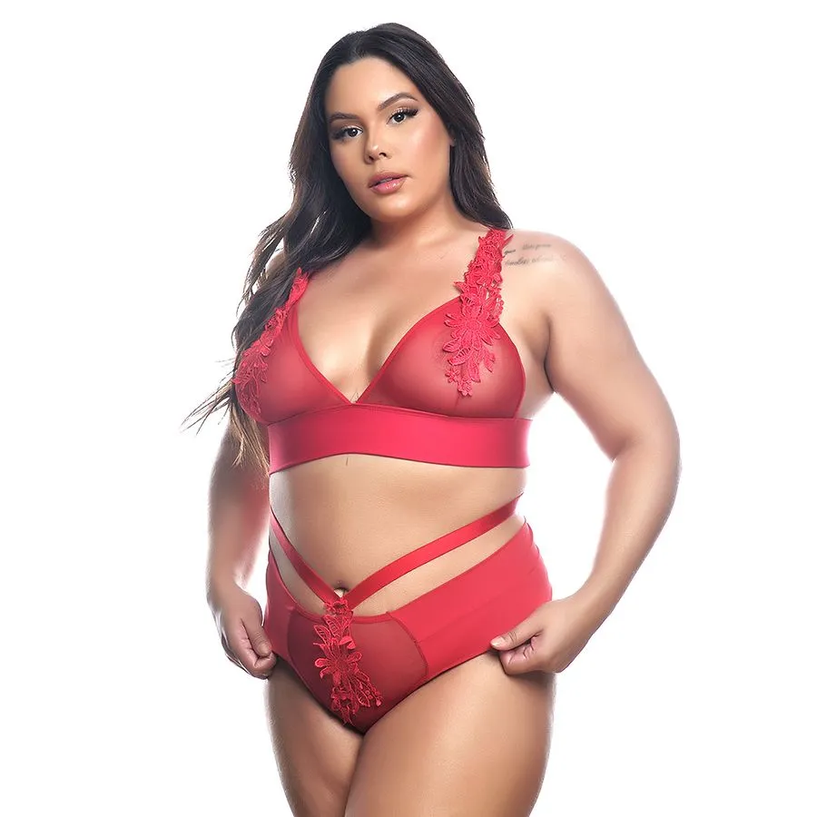 Todo feito em tecido transparente, ele deixa toda a sensualidade de seu corpo mostra, os apliques florais em renda, dão um toque de mistério a peça, escondendo partes importantes que o homem sempre deseja ver. As fitas modelam a cintura deixando-as marcadas.