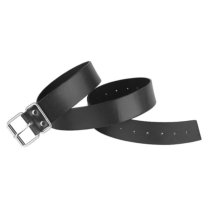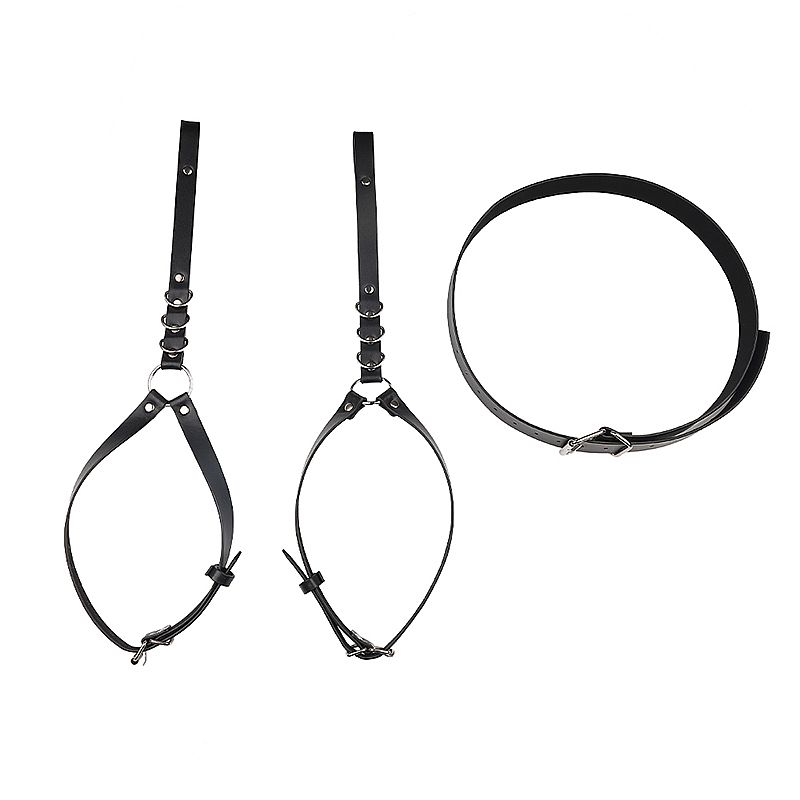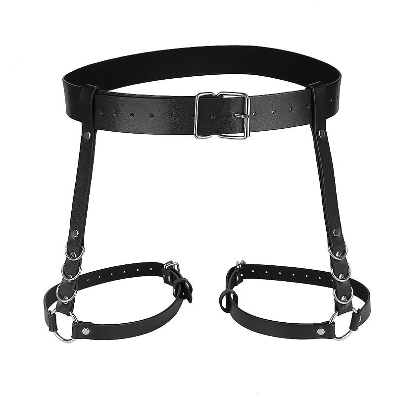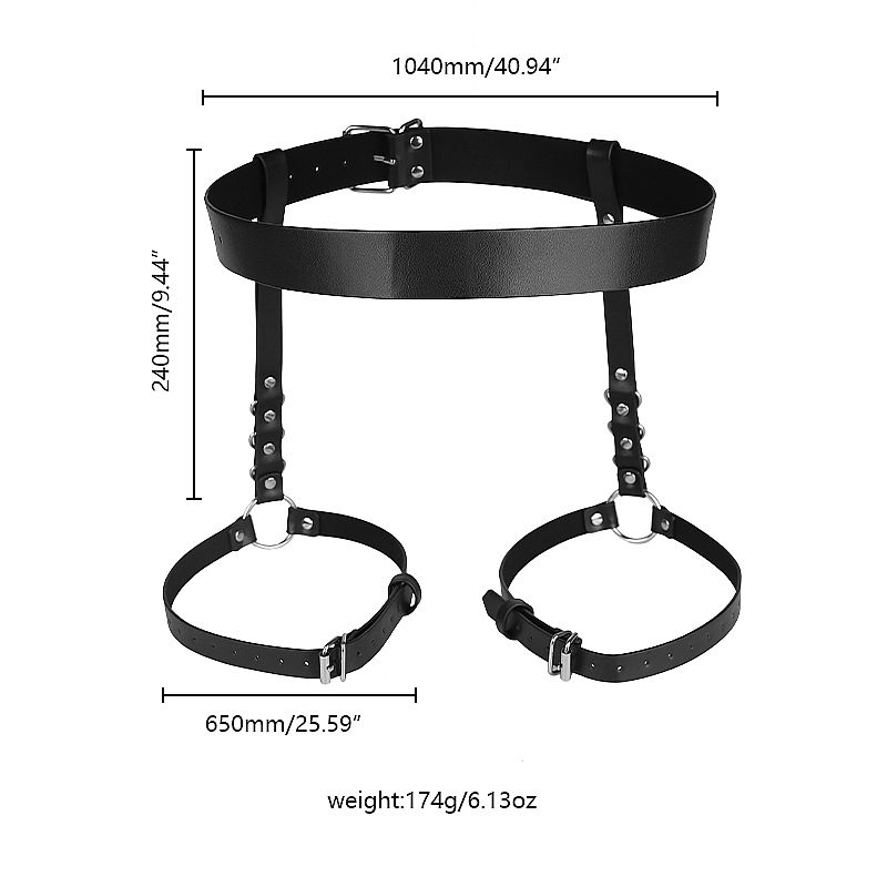 Cinta Liga confeccionadas em couro sintético com detalhes em rebite, fivelas para ajuste e corrente em metal, que prende as peças entre si.