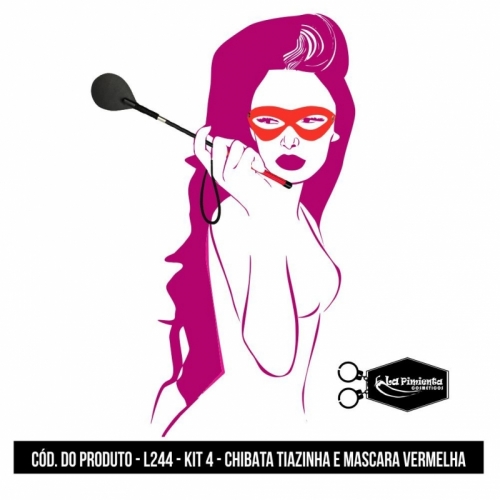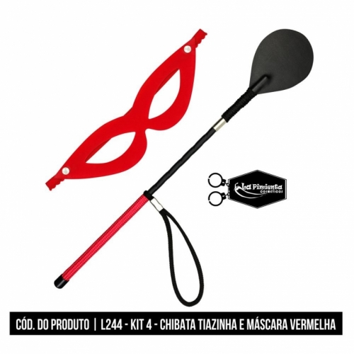 Chibata arredondada tiazinha confeccionada artesanalmente em sintético semelhante à couro com cabo emborrachado revestido de poliéster trabalhado. Máscara tiazinha também fabricada em sintético semelhante à couro com revestimento interno aveludado que garante conforto. Fino recorte no formato dos olhos para adaptação perfeita no rosto.