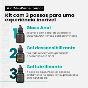 Desenvolvido para você que busca novos prazes, o Kit Meu Primeiro Anal é composto por 3 itens: Gloss Anal, Gel Lubrificante e Gel Dessensibilizante. Juntos, proporcionam uma experiência altamente prazerosa para o casal.