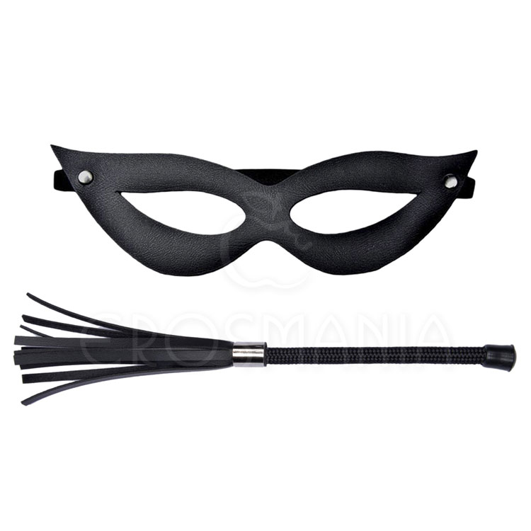 Kit para iniciação no fetiche sado, composto por: máscara com detalhes em rebites e elásticos atrás, chicote com cabo forrado em nylon, flagelos (tiras) e haste. Perfeito para apimentar a vida amorosa.